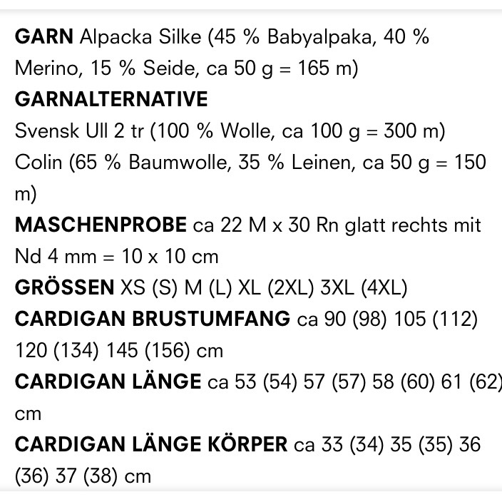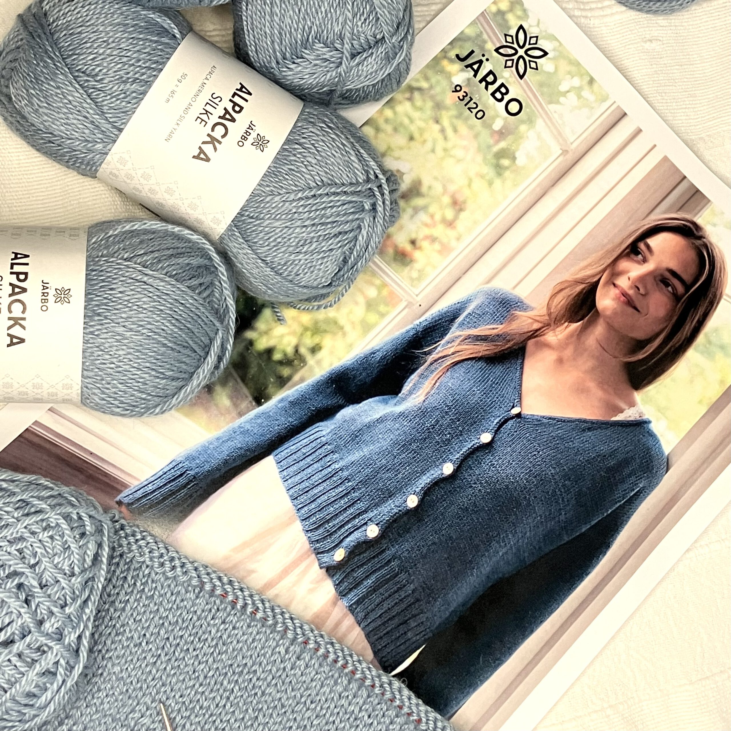 Ich stricke meine VÄGEN Strickjacke in der Größe S mit dem Garn Alpacka Silke (45% Babyalpaka, 40% Merino, 15% Seide, 50g = 165m) in der Farbe 29509 Blue Gust. Das Garn ist wunderbar weich und lässt sich ganz toll verstricken, das Maschenbild ist schön gleichmässig.