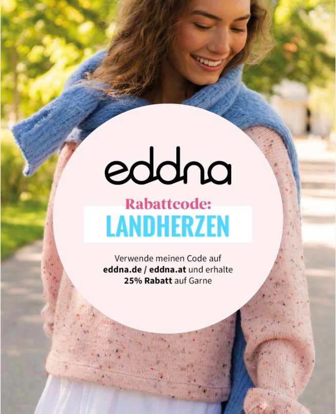 Mit meinem Rabatt-Code: LANDHERZEN erhältst Du 25% Rabatt im eddna-Shop auf alle Garne, gültig 10.2.2026 – 9.3.2026